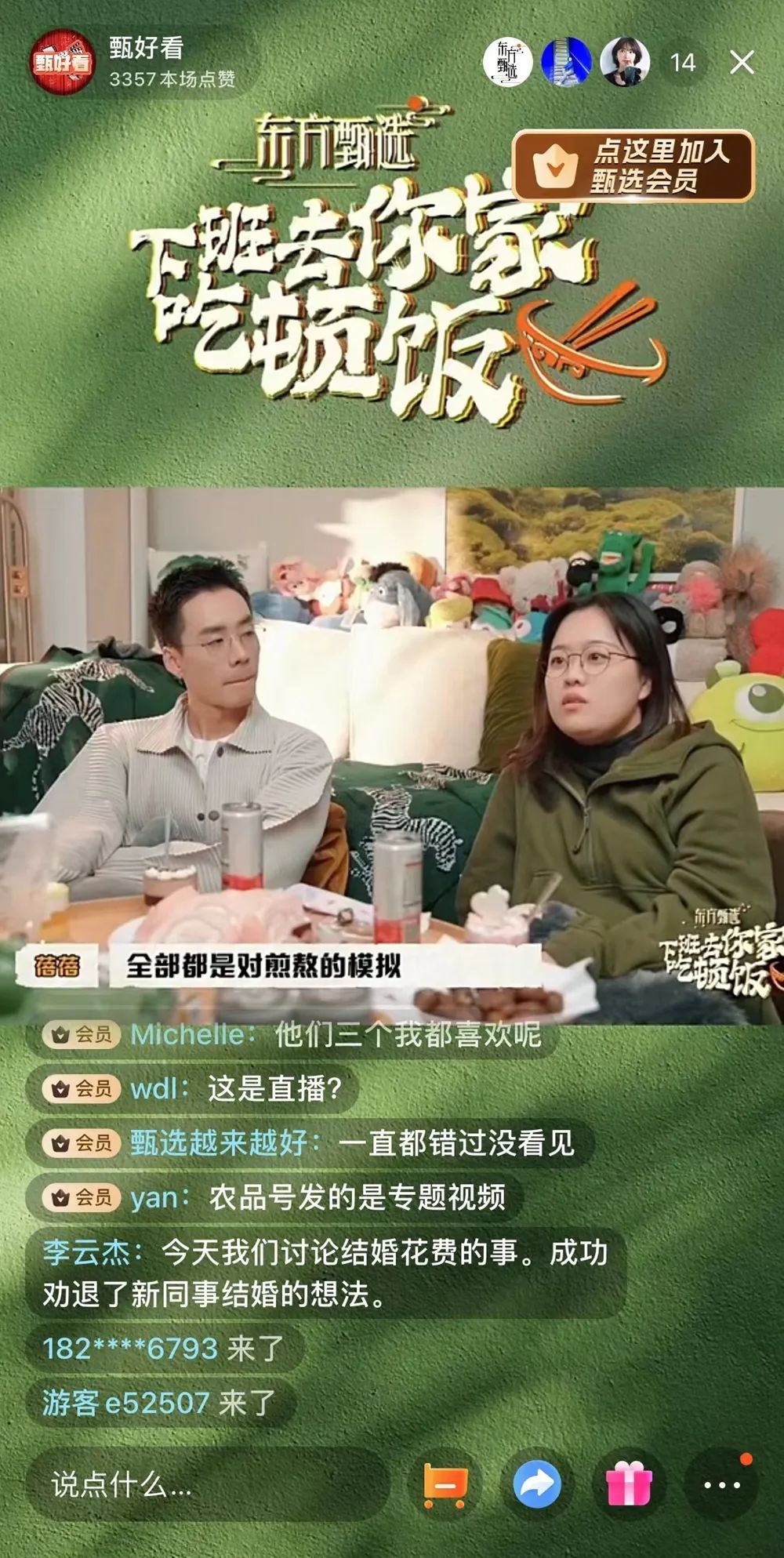 俞敏洪在嘉宾录出镜,顿顿在甄好看对聊,并拥有了综艺性质的节目《下班去你家吃顿饭》。而其他直播间则都是陌生面孔。