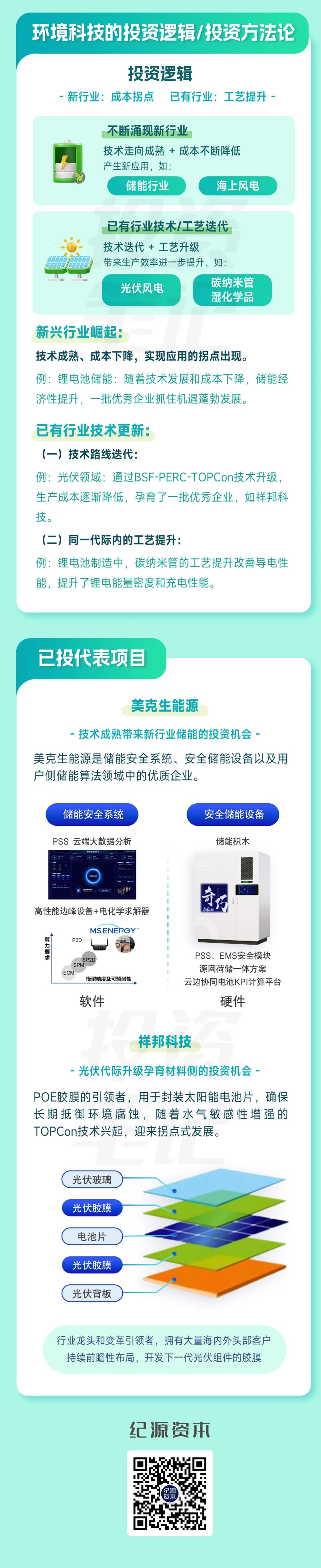 在新能源技术领域,纪源资本投资的美克生能源,是一家新能源储能综合系统及安全算法的科创企业。纪源资本投资的祥邦科技,是光伏领域的新材料高科技团队;在工艺工业领域,高频科技,是关于高纯水工艺的技术公司;蘑菇物联,是工业领域的智能物联网节能算法公司。