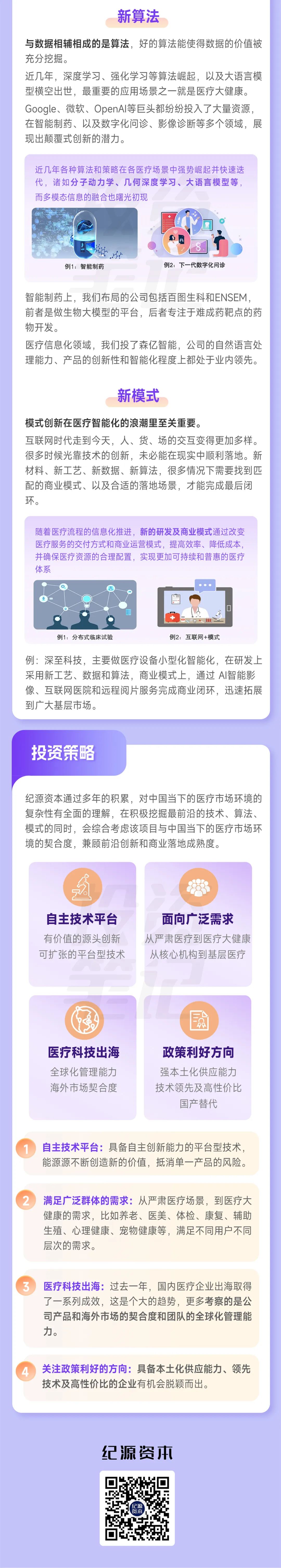纪源资本长期关注科技医疗行业,持续关注互联网医疗模式。因此,我们对中国医疗行业的当前市场环境和监管环境有着深刻的理解和认识。在积极挖掘新技术、新算法、新模式的同时,我们注重这些创新与中国医疗市场环境的契合度,并在创新性与商业落地的成熟度之间保持平衡。基于这一平衡标准,纪源资本在医疗科技领域的投资主题划分为四个方向。