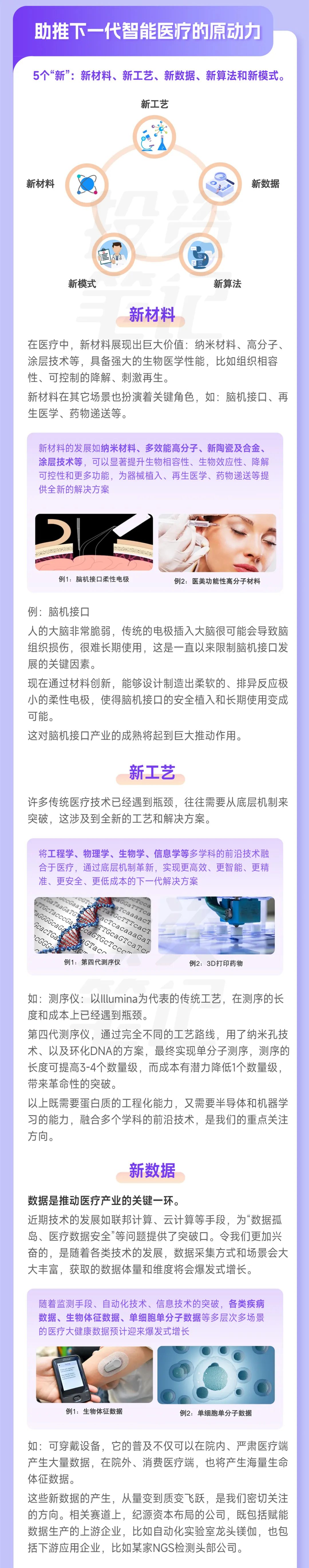 放眼全球,各种科技媒体和科技界大佬普遍看好医疗的智能化趋势,比如马斯克创办的脑机接口公司,以及贝索斯重仓投资的抗衰老项目,这种科技和医疗的融合趋势会给医疗行业带来全新的变革。那么助推下一代智能医疗的原动力是什么呢?我们总结为 5个“新”:新材料、新工艺、新数据、新算法和新模式。
