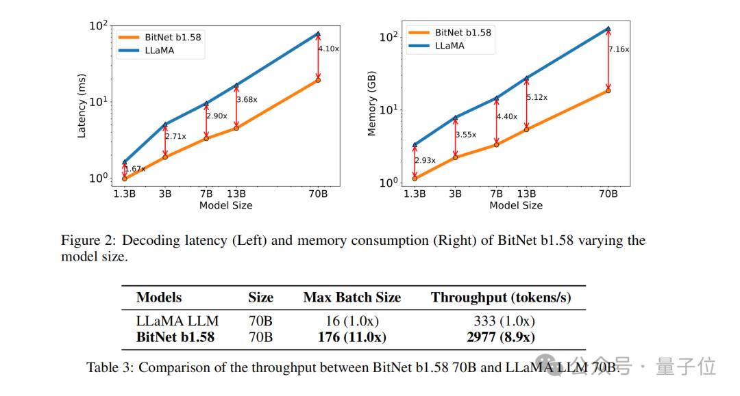 例如BitNet b1.58在3B模型大小时与Llama做比较,速度提高了2.71倍的同时,GPU内存使用几乎仅是原先的四分之一。