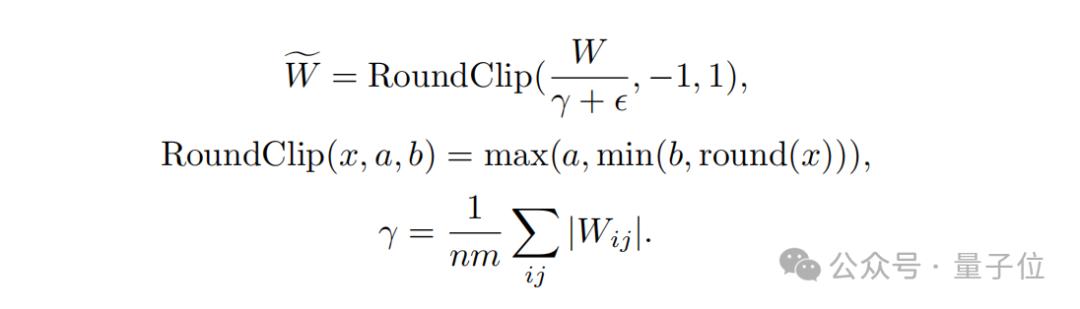 其次,在量化函数设计方面,为了将权重限制在-1、0或+1之间,研究者们采用了一种称为absmean的量化函数。