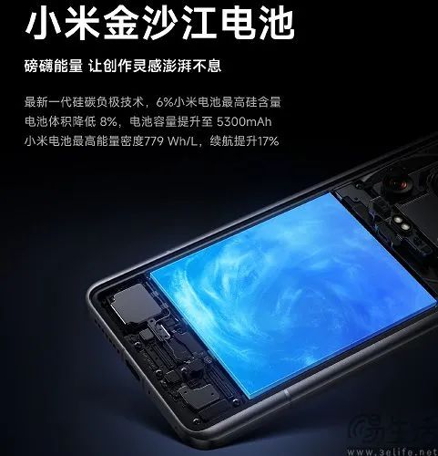 具体而言,在小米14 Ultra上配备的金沙江电池就使用了硅碳负极技术,其一大优势是能够有效提升电池的能量密度,而且还可以进一步控制电池模组的体型。由于目前硅材料负极存在体积膨胀率高,以及首次循环锂损耗的问题,因此当前行业内普遍也应用了“掺硅补锂”技术的硅碳负极。而金沙江电池凭借6%硅含量的碳硅负极设计,则达到了779Wh/L的能量密度,不仅拥有单电芯5300mAh的容量,还实现了1600次循环后依然保有80%以上容量的长寿特性。