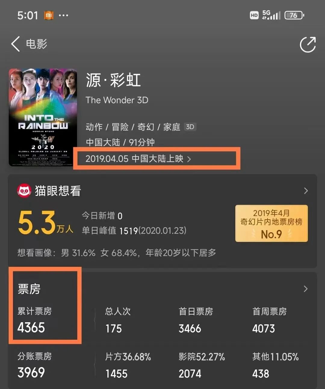 但事实上,在刘丹购买《源·彩虹》之前,这部影片在2019年4月就已经上映,票房为4365元。2020年,刘丹花2万多元请了律师打官司,她把律师函邮寄给了东阳畅毅,但已经人去楼空,律师函也被退回来了。