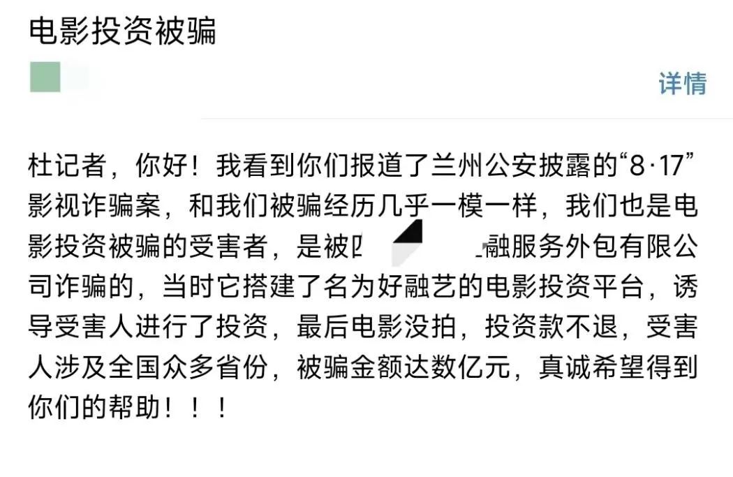 兰州市公安局方面向记者表示,上述案件预计有3000多位受害者,因为受害人遍布全国且人数众多,仍有部分受害人尚未报案。报道刊发后,记者收到众多读者邮件,他们大多称自己的遭遇与“8•17”影视投资诈骗案如出一辙。“先是进入荐股群,没多久‘荐股老师’开始介绍‘影视大佬’来跟大家介绍影视投资项目。”