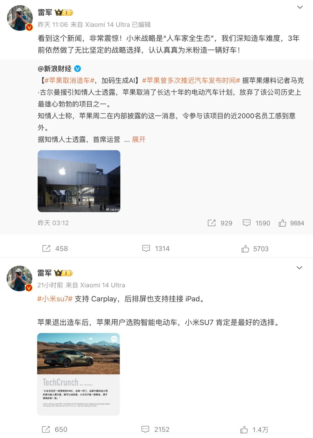 日前,小米创始人雷军在听闻苹果取消造车新闻之后,表示非常震惊,并发微博称,“小米战略是‘人车家全生态’,苹果退出造车后,苹果用户选购智能电动车,小米SU7肯定是最好的选择”。