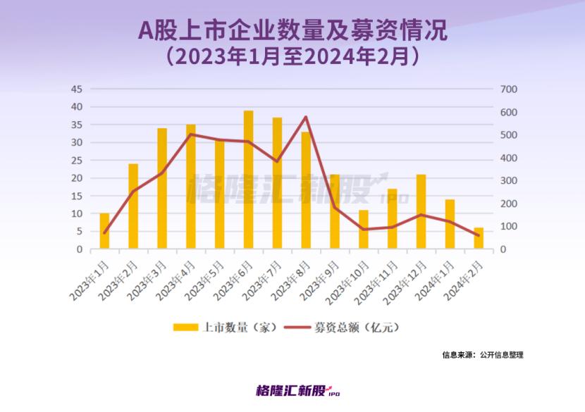 2024年1-2月,A股上市的新股数量为20家,募资总额约177亿元,而2023年前2个月共有34家新股上市,募资总额高达320亿元。