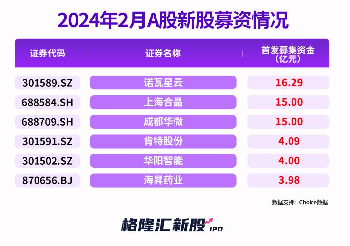 据Choice数据显示,2024年2月,A股仅6家新股上市,其中创业板3家、科创板2家,北交所1家,募资总额约58.36亿元,明显低于去年同期水平。