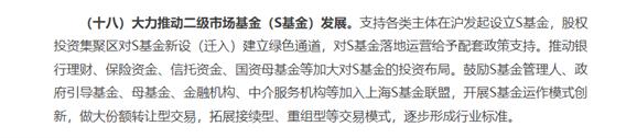 直到今年,上海政府持续加码S基金,在《关于进一步促进上海股权投资行业高质量发展的若干措施》提出,大力推动二级市场基金(S基金)发展。“推动二级市场基金(S基金)发展。支持各类主体在沪发起设立S基金,股权投资集聚区对S基金新设(迁入)建立绿色通道,对S基金落地运营给予配套政策支持。推动银行理财、保险资金、信托资金、国资母基金等加大对S基金的投资布局。鼓励S基金管理人、政府引导基金、母基金、金融机构、中介服务机构等加入上海S基金联盟,开展S基金运作模式创新,做大份额转让型交易,拓展接续型、重组型等交易模式,逐步形成行业标准。”