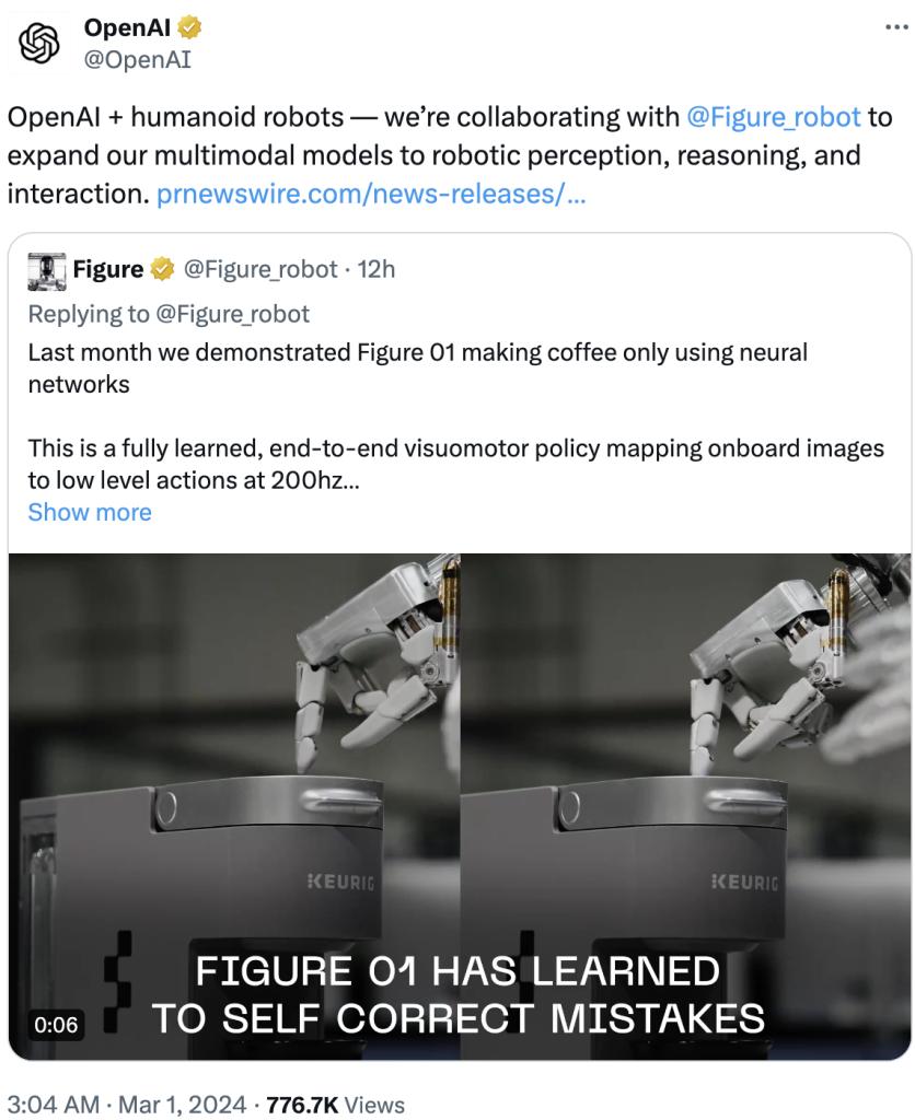OpenAI也转发了Figure的推文称,OpenAI正在与Figure合作,将其多模态模型扩展到机器人的感知、推理和交互中。