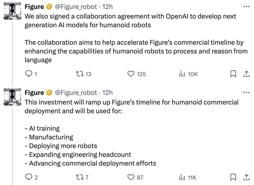 Figure还官宣了与OpenAI、微软达成合作,将与OpenAI合作开发下一代人形机器人AI模型,利用微软云进行AI基础设施构建、训练等。