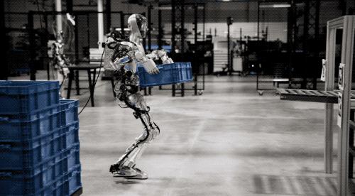 本周,Figure还发布了一段机器人在工厂的视频,视频中的机器人连着绳索,可以自行走到箱子前,然后搬箱子放到传送带上。