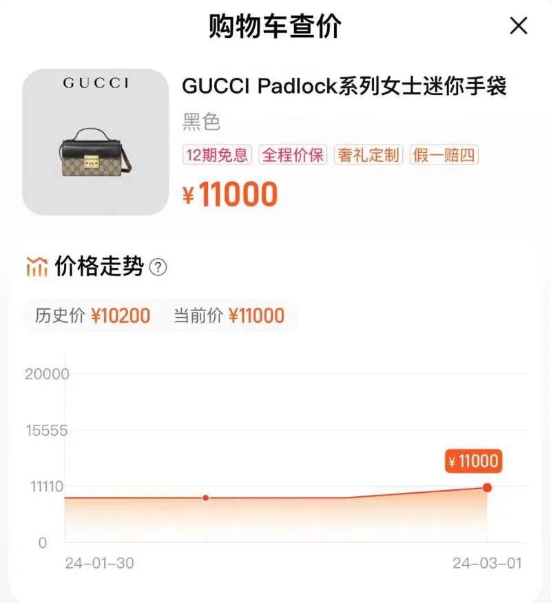 还有网友晒出的古驰Ophidia系列迷你托特包由11000元涨至12700元,涨了1700元,涨幅15.5%;另一款古驰Padlock系列迷你手袋价格从10200元涨至11000元,上涨800元,涨幅近8%。