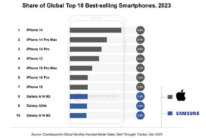 市场研究机构Counterpoint Research公布的2023年全球智能手机单机型出货量排行榜中,前7名均为iPhone,而余下三名则是三星的中低端机型。耐人寻味的是,登顶冠军的机型并非新发售的iPhone 15系列,而是iPhone 14。