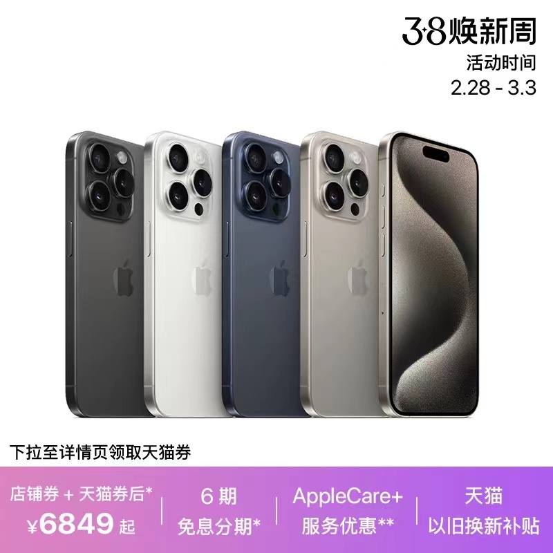 在「春日焕新季」活动里,Apple天猫旗舰店给出了满5999-1000大额优惠券,再叠上天猫券后,可实现4849元入手iPhone 15、6849元入手iPhone 15 Pro,相当划算。或许会有小伙伴说,这样的价格其实在各平台的百亿补贴活动里早就有了,但Apple天猫期舰店毕竟是官方渠道,享受的售后、服务、保修都有一定的保证。