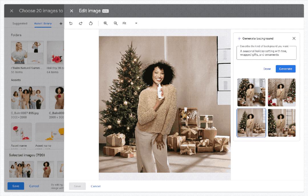 去年 11 月,Google 为广告商上线了生成式 AI 服务,其中一项是,如果商家已经有了模特拿着产品的素材,那么就可以随意更换背景,让广告在不同节日和季节使用。