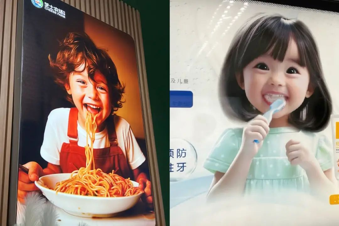 和 AI 威尔·史密斯吃意大利面的水平半斤八两,小男孩的面条与嘴唇难舍难分。代言牙膏的赛博小女孩,应该没有什么蛀牙的烦恼,眼睛大到可怕,皮肤光滑得一丝纹理也无,像陶瓷做的娃娃。