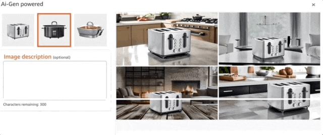 不善于创意表达的广告商,只需选择产品并单击「生成」,亚马逊就会利用生成式 AI,根据产品详细信息,在几秒钟内提供一组更有烟火气、更接近日常生活的图像,广告商还可以通过输入简短的文本提示细化图像。