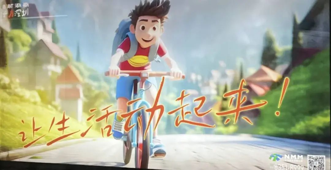这组广告真实存在,出自深圳地铁,官方盖章由 AI 创作,他们还有一组广告主打运动风,同样由可爱的卡通人物们代言,其中一个小男孩的自行车没有坐垫,尽管他面色轻松,但局部的身体状况很让人担心。