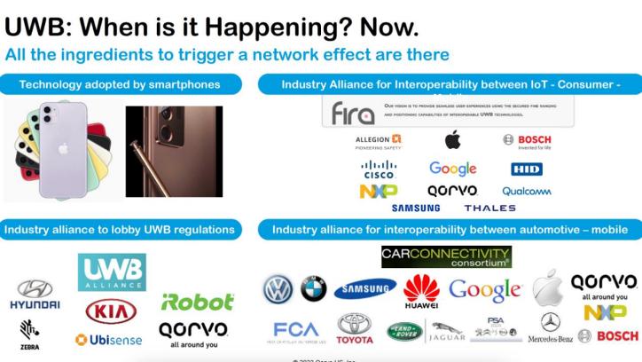 上述应用会促使UWB在汽车市场的应用推广,而相应的,汽车用户需要用手机中的UWB芯片和汽车的UWB芯片进行交互,进而手机UWB芯片的大规模应用会反向推动其他消费类电子使用UWB技术。