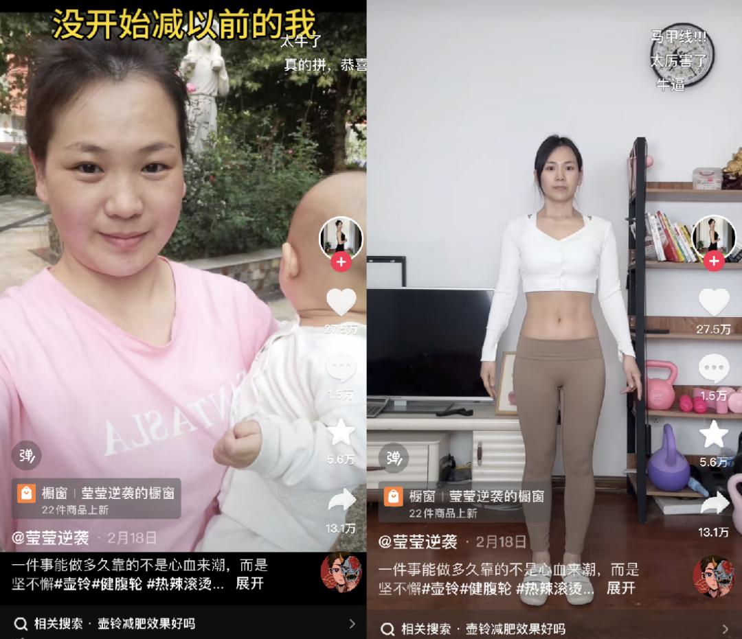 壶铃还成了“妈妈救星”,有不少二胎、三胎宝妈晒出每天坚持壶铃减肥的视频,博主“莹莹逆袭”5个月暴瘦45斤,拿下27.5万点赞。大量健身KOL开始科普壶铃动作示范,鼓励女孩们练出“蜜桃臀”。