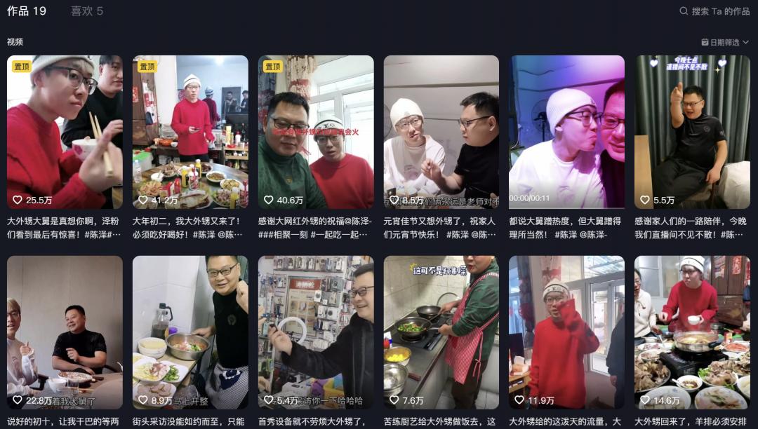 其实都是一些不到 10s 的日常片段,但由于视频中出现了陈泽,发出后数据自然像投了流一样飙升,现在连带着大舅的粉丝都涨到了二十几万。