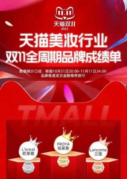 2023年双十一期间,珀莱雅成为了天猫大促美妆榜的第一名。抖音平台上,韩束也位居销售排行榜首位。