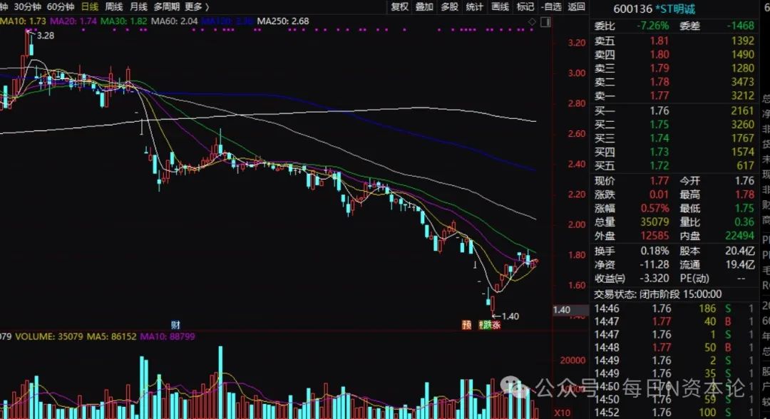 不仅如此,*ST明诚的资金链相当紧张。截至2023年三季度的财报显示,*ST明诚货币资金为6944.26万元,但其短期借款就高达1.81亿元,一年内到期的非流动负债更是达到了令人咋舌的14.84亿元。直白点说,*ST明诚的资金链随时可能断裂。