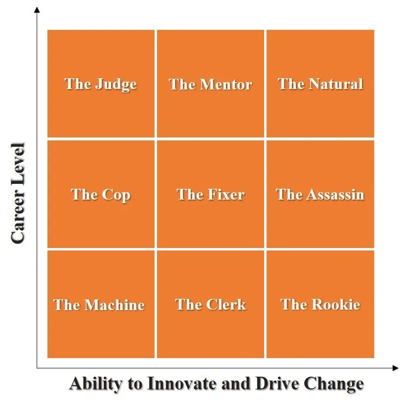 先来看另外一个研究成果。克里斯·邓恩(Kris Dunn)写了一本书,叫做《The 9 Faces of HR—人力资源的九张面孔》。他根据人力资源专业人员的职业水平以及他们的创新和推动变革能力,将“人力资源”划分为九个不同的角色,包括:The Natural、The Mentor、The Judge、The Assassin、The Fixer、The Cop、The Rookie、The Clerk、The Machine。例如:The Cop,克里斯·邓恩认为很多处于职业发展中期的 HR 专业人士属于这个角色,他们担任人力资源经理,或者人力资源总监。通常依靠成熟的体系以及稳定的结构,确保必要的“管控”并最小化风险,因而创新、推动变革,以及为组织创造增量价值的能力较低,如果我们从MBTI的视角来看,这类角色极有可能表现出ESTJ的特质,也就是注重“体系”,并且务实。
