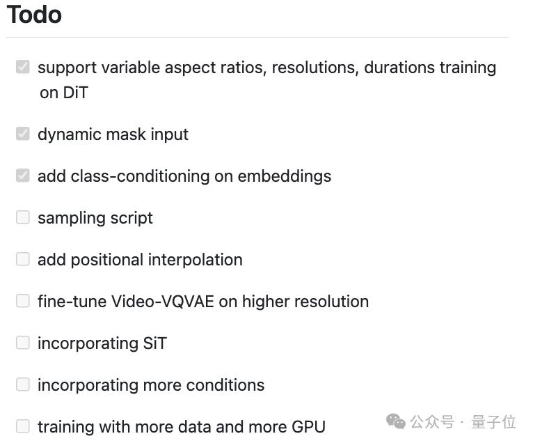 而从目前已经列出的9项to do事项来看,除了可变长宽比、可变分辨率和可变时长,动态掩码输入、在embeddings上添加类条件这两个任务也已完成。
