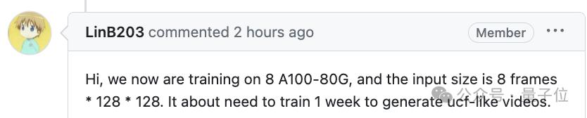 成员介绍,目前的训练是在8个A100-80G上进行的(明显还远远不够),输入大小为8帧 128 128,大概需要1周时间才能生成类似ucf(一个视频数据集)的效果。
