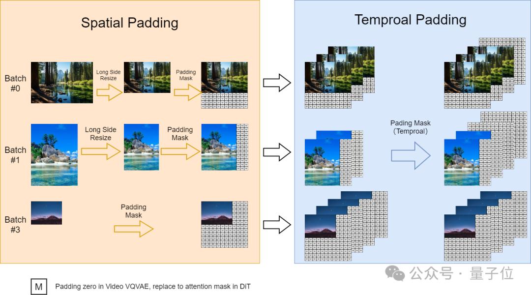 具体来说, 我们将高分辨率视频在保持长宽比的同时下采样至最长边为256像素, 然后在右侧和底部用零填充至一致的256x256分辨率。这样便于videovae以批量编码视频, 以及便于扩散模型使用注意力掩码对批量潜变量进行去噪。
