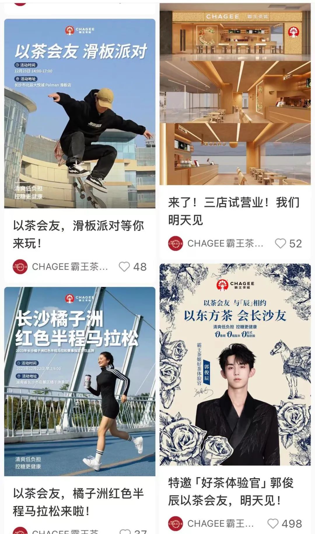 去年12月,霸王茶姬长沙开启试营业,前后释放多个营销连招。最初借助“以茶会友”,进入芒果TV和中南林业大学、湖南工商大学等地方举办小型活动,而后,也在长沙半程马拉松、时装周和于文文演唱会等活动中刷脸。国金街A层店面开启试营业后,则前后有郭俊辰、翟潇闻和陈星旭等年轻明星举办“好茶体验官”见面会。