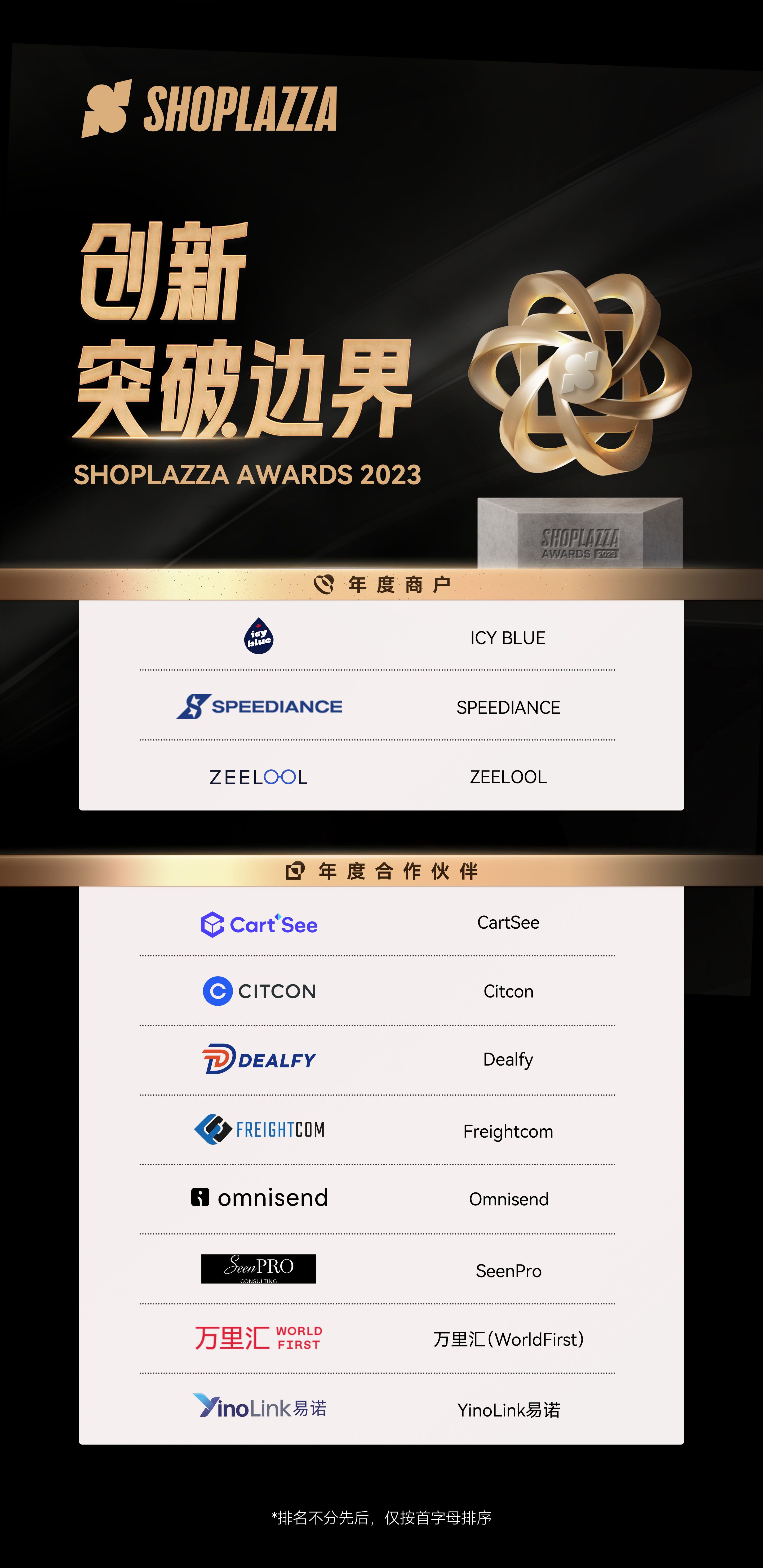 据了解,Shoplazza Awards主要维度包括产品创新探索、生意增长、品牌增长、用户体验等方面。不将商户与服务商的体量规模作为核心权重,也足以得见比起赢家通吃,店匠科技更看重开放与创新的价值。