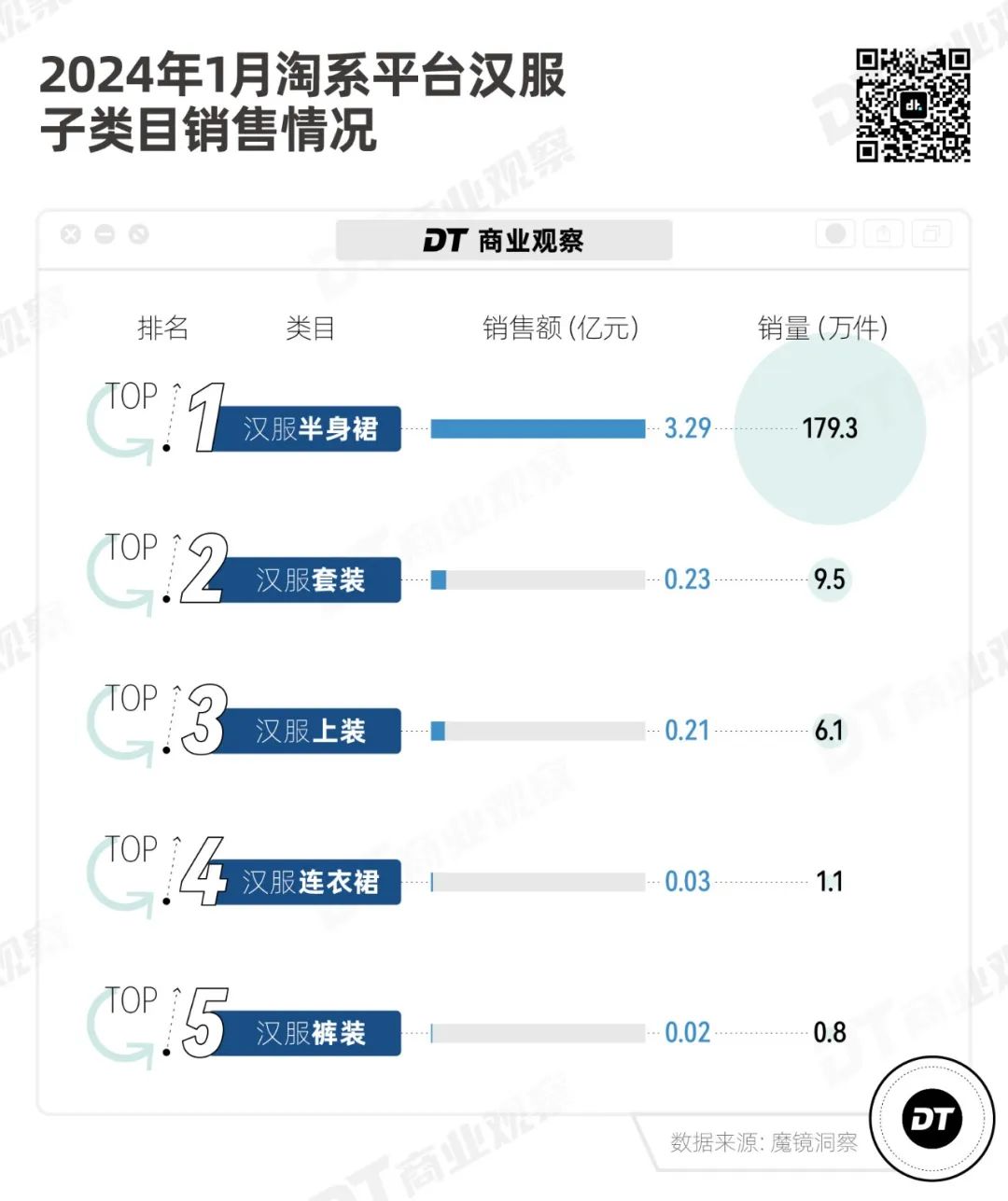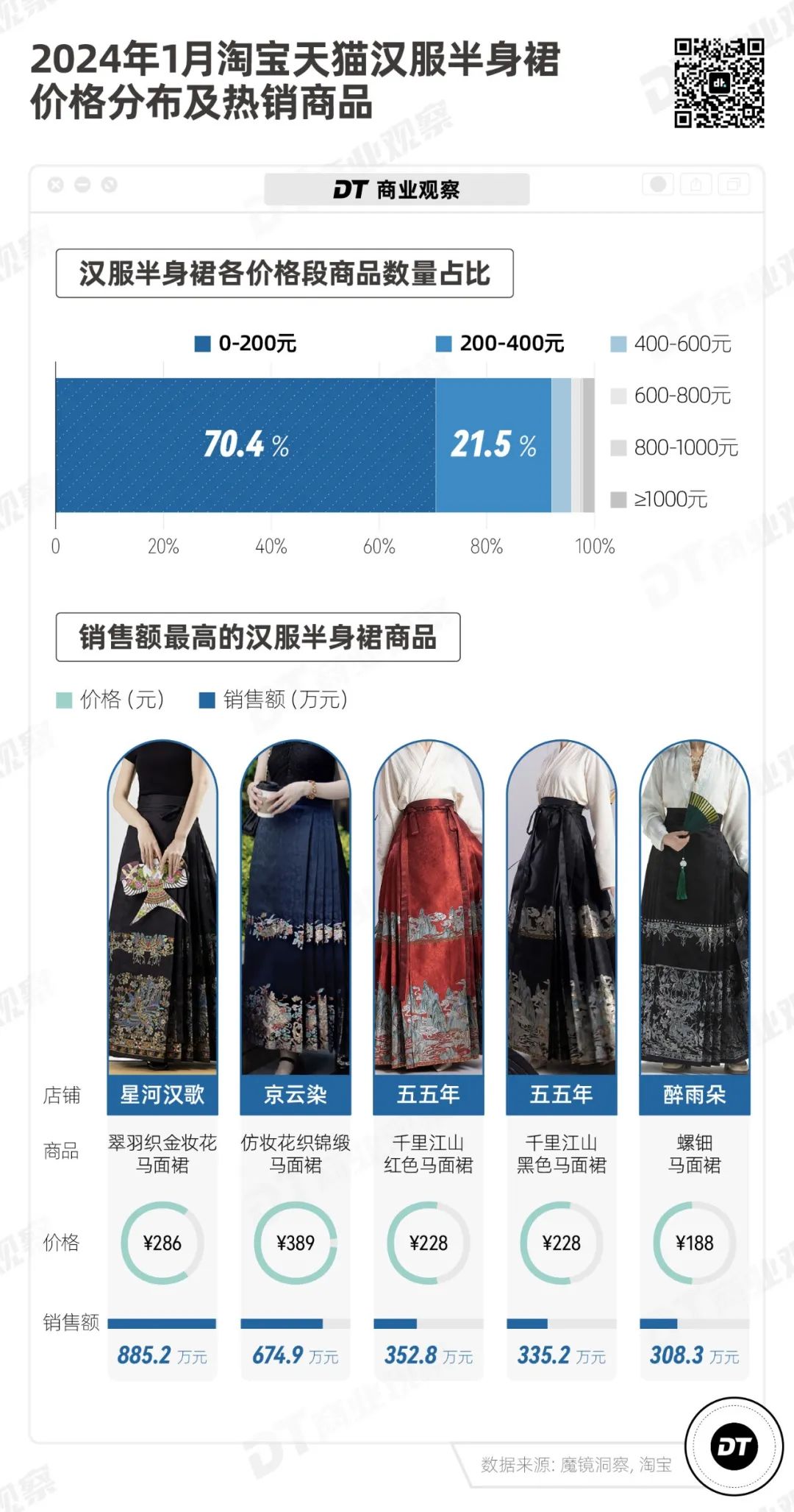 魔镜洞察数据显示,2024年1月汉服半身裙的销售额超3亿,占整个汉服品类的近9成,而汉服半身裙的主要商品就是马面裙。