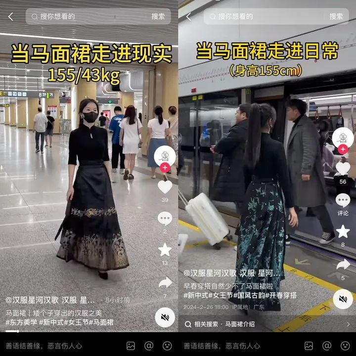 打开星河汉歌的抖音旗舰店,可以看到一系列“当马面裙走进日常”的短视频,模特穿着马面裙行走在商场、地铁站等通勤场景,释放出日常生活中也能穿马面裙的信号。