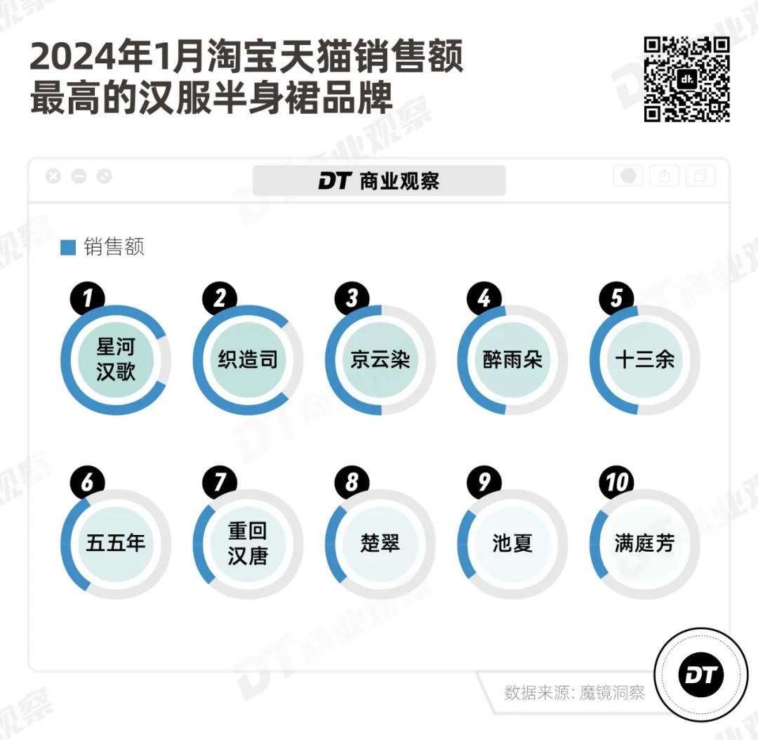 2024年1月,淘宝天猫汉服半身裙的销售额同比增长171.2%,许多成立不久的新品牌嗅到商机并迅速涌入,吃到了这波汉服经济的红利。