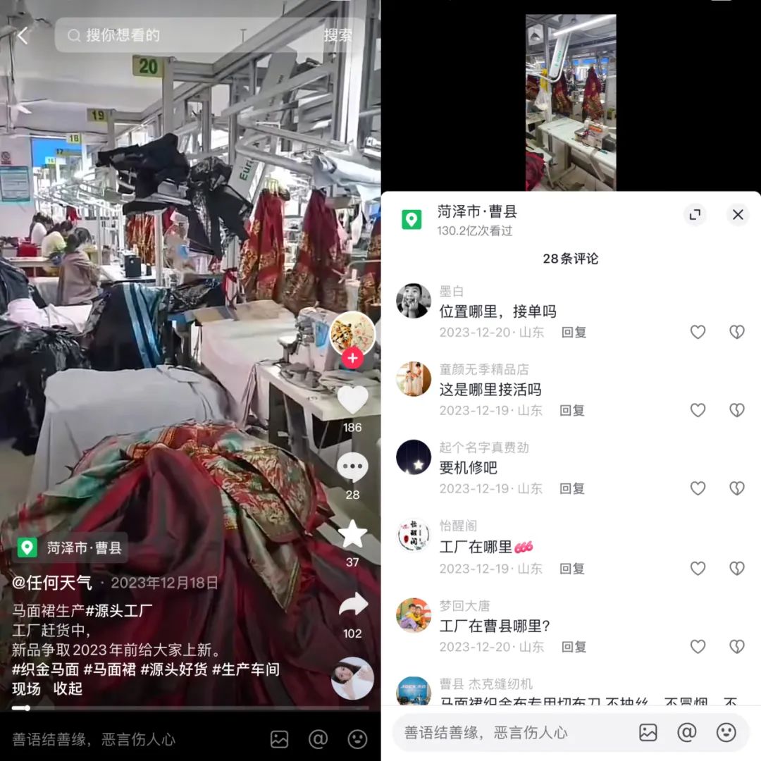 首先,一些加工厂主动在社交媒体上展示流水线生产视频,借助马面裙热度,很容易就引来客户的主动询单,或是直接到成品车间挑货。