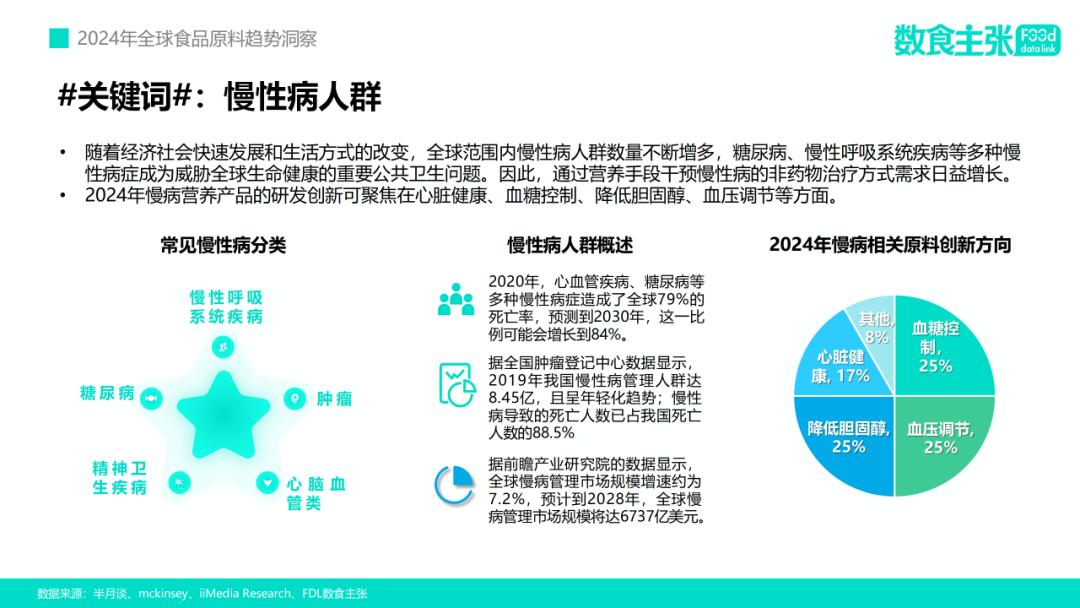 在原料端,据FDL数食主张数据显示,2023年全球食品原料中支持血糖控制、血压调节、降低胆固醇的功能性原料占比均达到了25%,支持心脏健康的原料也达到了17%。未来慢病营养产品的研发创新可基于这些方面进行细化开发。