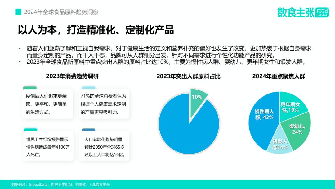 据数食主张统计,2023年全球食品新原料中重点突出人群的原料占比达10%,其中慢性病人群占比43%、婴幼儿群体占比24%、更年期女性占比19%、银发人群占比达14%。