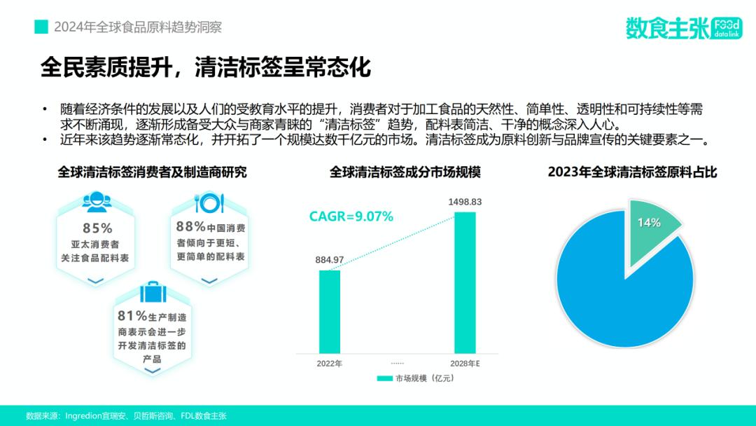 近年来该趋势逐渐常态化,并开拓了一个规模达数千亿元的市场。数据显示,预计到2028年全球清洁标签成分市场规模将达到1498.83亿元,在预测期间清洁标签成分市场年复合增长率预估为9.07%。
