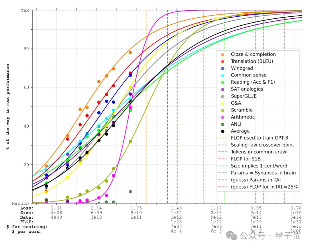 而Lanrian展示的外推预测显示,AI性能似乎随着参数量一同达到了人类水平。
