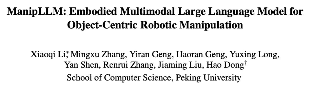 此前,「甲子光年」独家获悉,北京大学前沿计算机研究中心助理教授、博士生导师董豪团队发布的最新具身大模型研究成果——ManipLLM的论文已被计算机视觉领域顶会CVPR 2024接收。