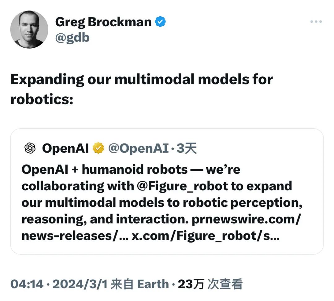 合作消息公布后,OpenAI CEO Greg Brokman也在 X 上转发表示,OpenAI正在将多模态模型拓展到机器人上。