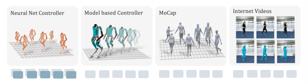 该团队构建了一个轨迹数据集用于训练模型,有四大数据来源:先前的神经网络策略,基于模型的控制器,人类运动捕捉,以及YouTube上的人类视频。