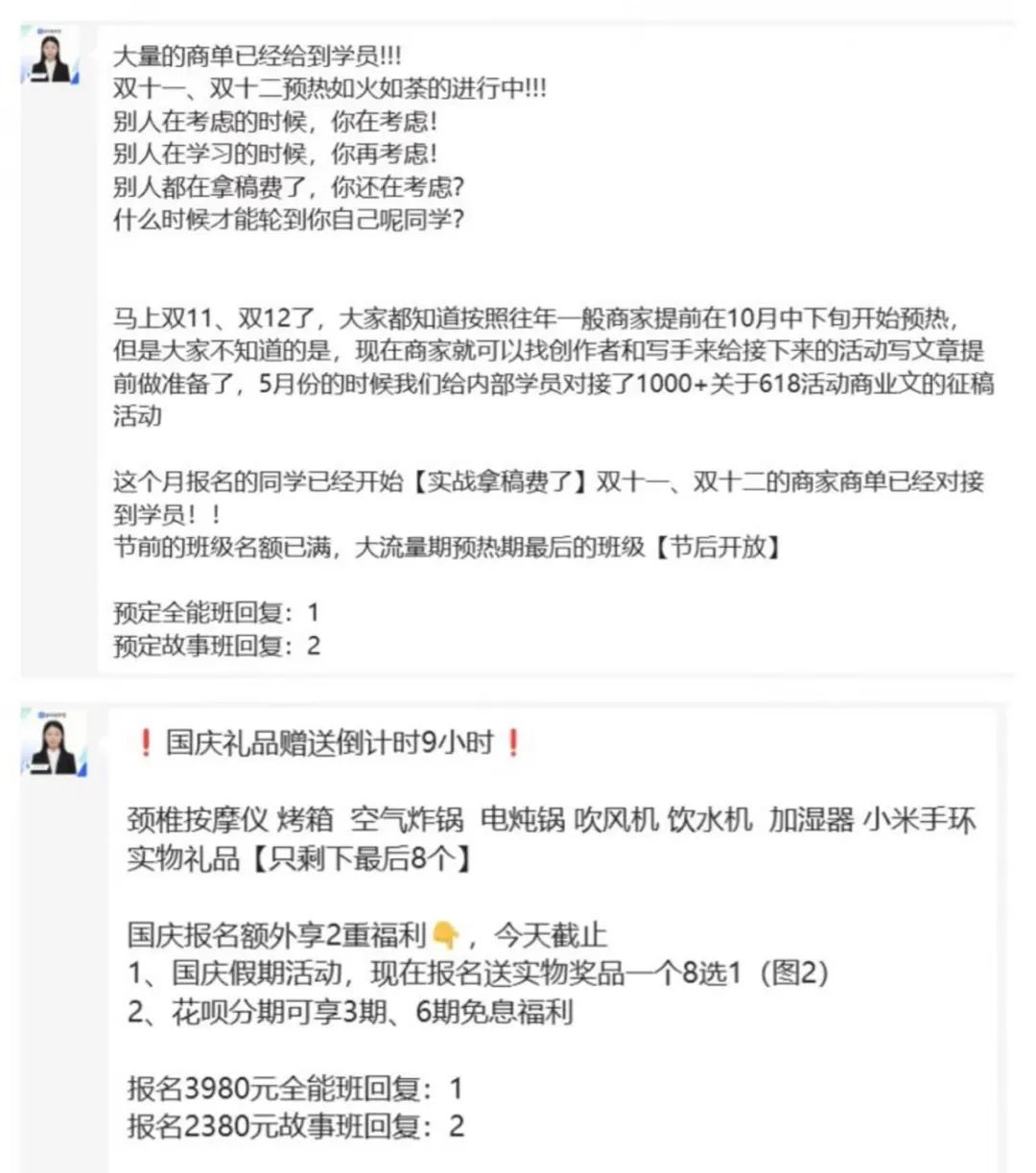 为了强化效果,助教老师还会在课后对所有学员私发消息,进而捕捞出部分有意向的学员第一时间跟进,凭借无休止的话术轰炸,一些鸡肋小优惠,直到把你说到听劝,乖乖买单。