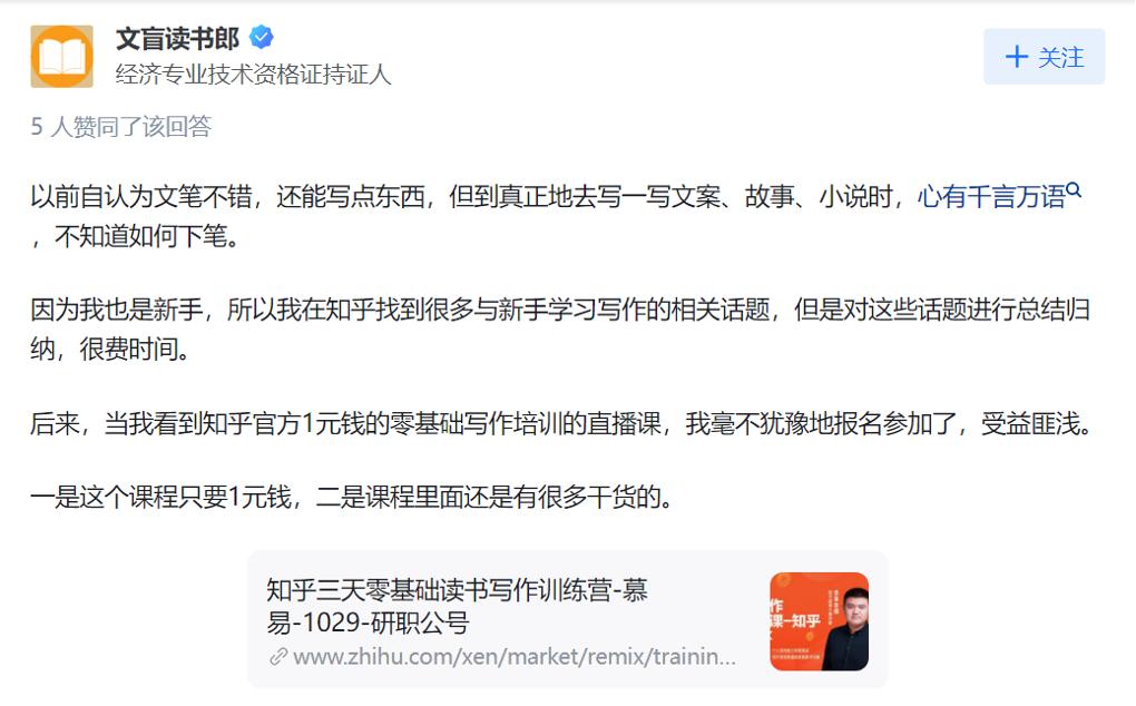 就以笔者亲身经历的知乎故事小说课为例。先是在知乎的各个内容板块,以及微信、微博、小红书、抖音、快手、B站等流量平台投放“怎样通过在家写作兼职赚钱?”“我想写文赚钱,怎么做”的广告,并在文中附上“一元写作课”的链接入口,吸引一大批着急“恰饭”的妈妈党、学生党、失业大军前来。
