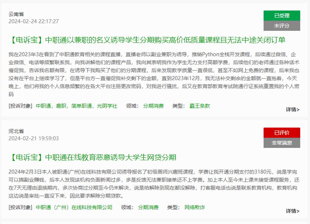 而在电诉宝、黑猫投诉、啄木鸟投诉等网站上,涉及中职通、高顿教育、大鹏教育、潭州教育等机构,与之相关的诱导贷款分期维权信息俯拾即是。