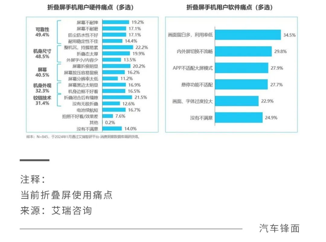 据艾瑞咨询的调研数据,折叠屏用户目前的使用痛点,主要都集中屏幕耐摔耐磨的可靠性和机身尺寸上。以荣耀Magic Vs2为例,其更换内屏的价格达到了2669元,而直板旗舰Magic6 Pro的换屏价格则只有1579元,隐性成本也是让用户望而却步的因素之一。