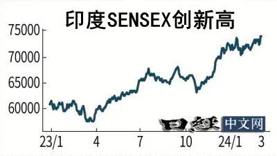 在印度的股票市场,3月4日主要股指SENSEX比前一天上涨0.1%,达到7.3872万点,刷新了最高点。Nifty50同样创出了最高点(2万2405点)。能源和IT(信息技术)概念股的股价表现强劲。大型财团信实工业的股价4日上涨1%,创出上市以来的新高。与2023年底相比,涨幅达到17%。